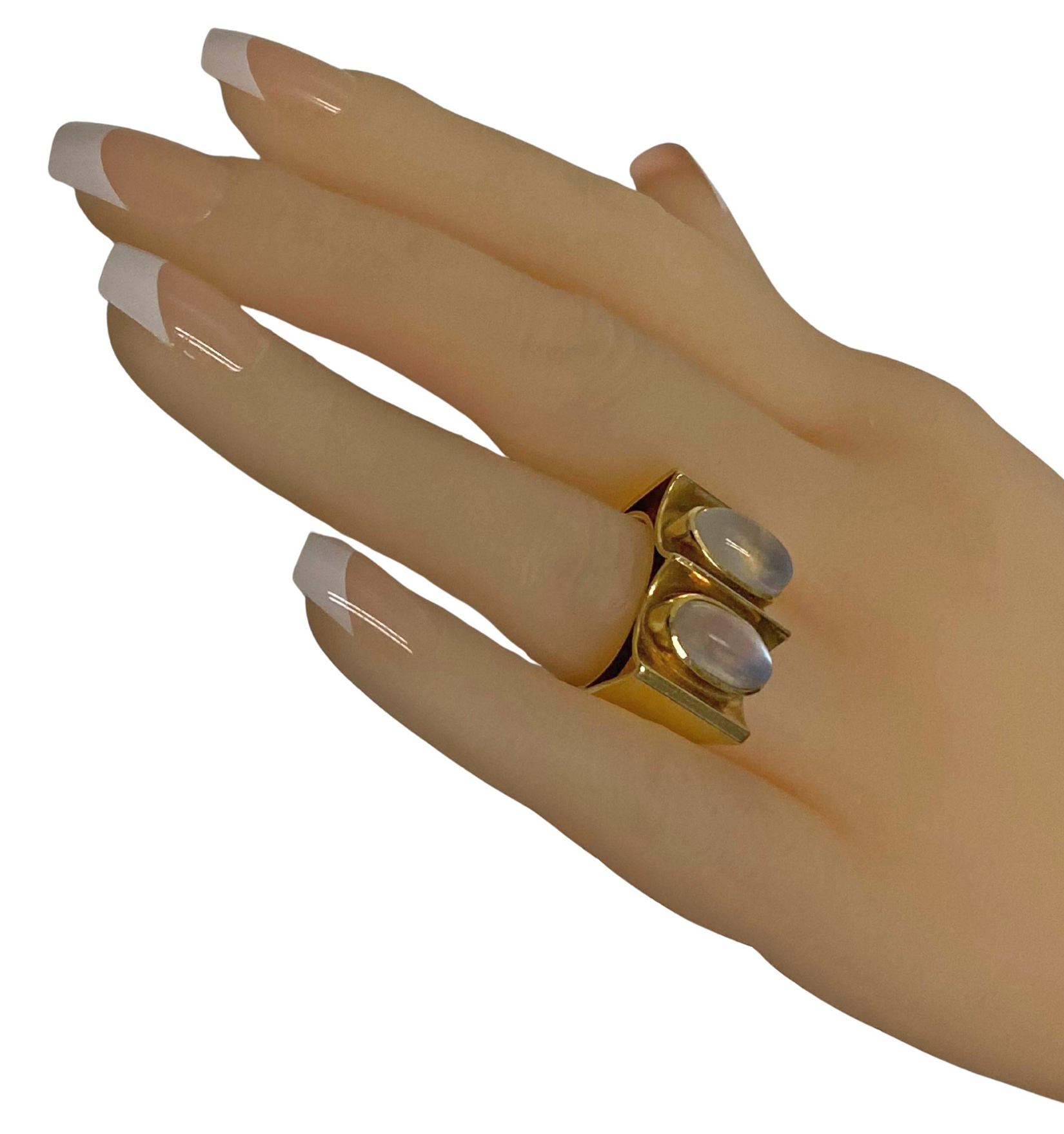 1970’s 18K Moonstone Modernism Abstract Ring. Stunning Ring with two oval cabochon moonstones bezel set each within a groove like quadrilateral setting, plain tapered mount. Stamped 750 on interior of shank. Top measures approximately 17 x 23 mm. Ring Size: 7.5. Total Item Weight: 16.54 grams. French gold owl import mark to outside of shank. Condition: Good. Reflections purely from photography only