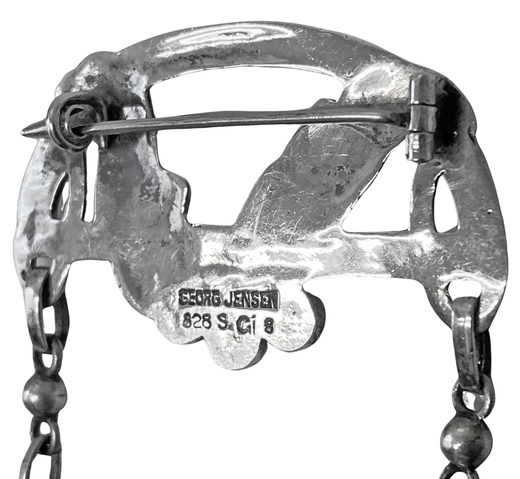 Antique early Georg Jensen brooch C.1909 design #8. The drop brooch with cabochon set green agates and two amber drops, twist foliate design. The reverse with Georg Jensen 828 S Gi 8. Marks for 1909 -1914. Measures 1 7/8″ x 2 3/8″ (4.8cm x 5.8cm). Item Weight: 15.36 grams. Condition: Good. Reflections from photography only. Lovely vibrant colours and original patina. Ref: P.124 Georg Jensen A Tradition of Splendid Silver Drucker