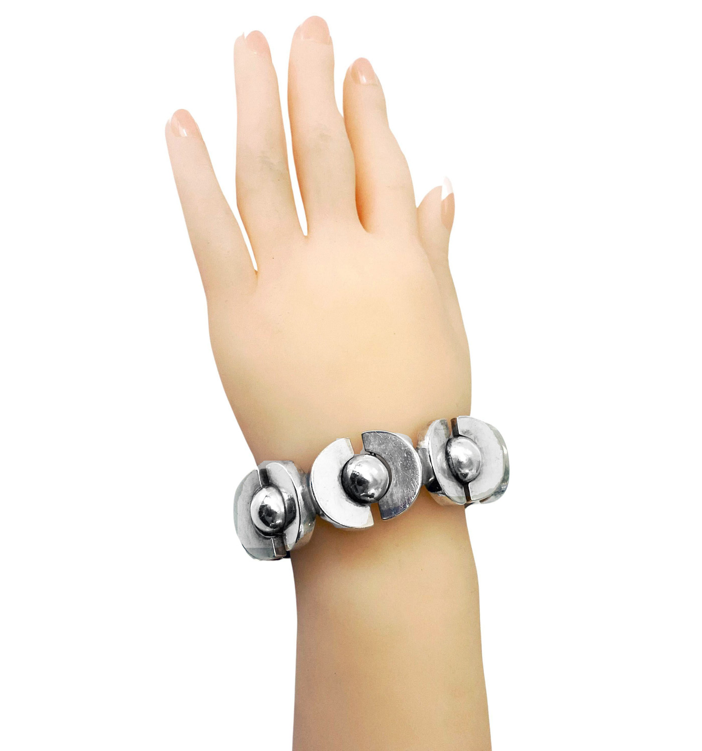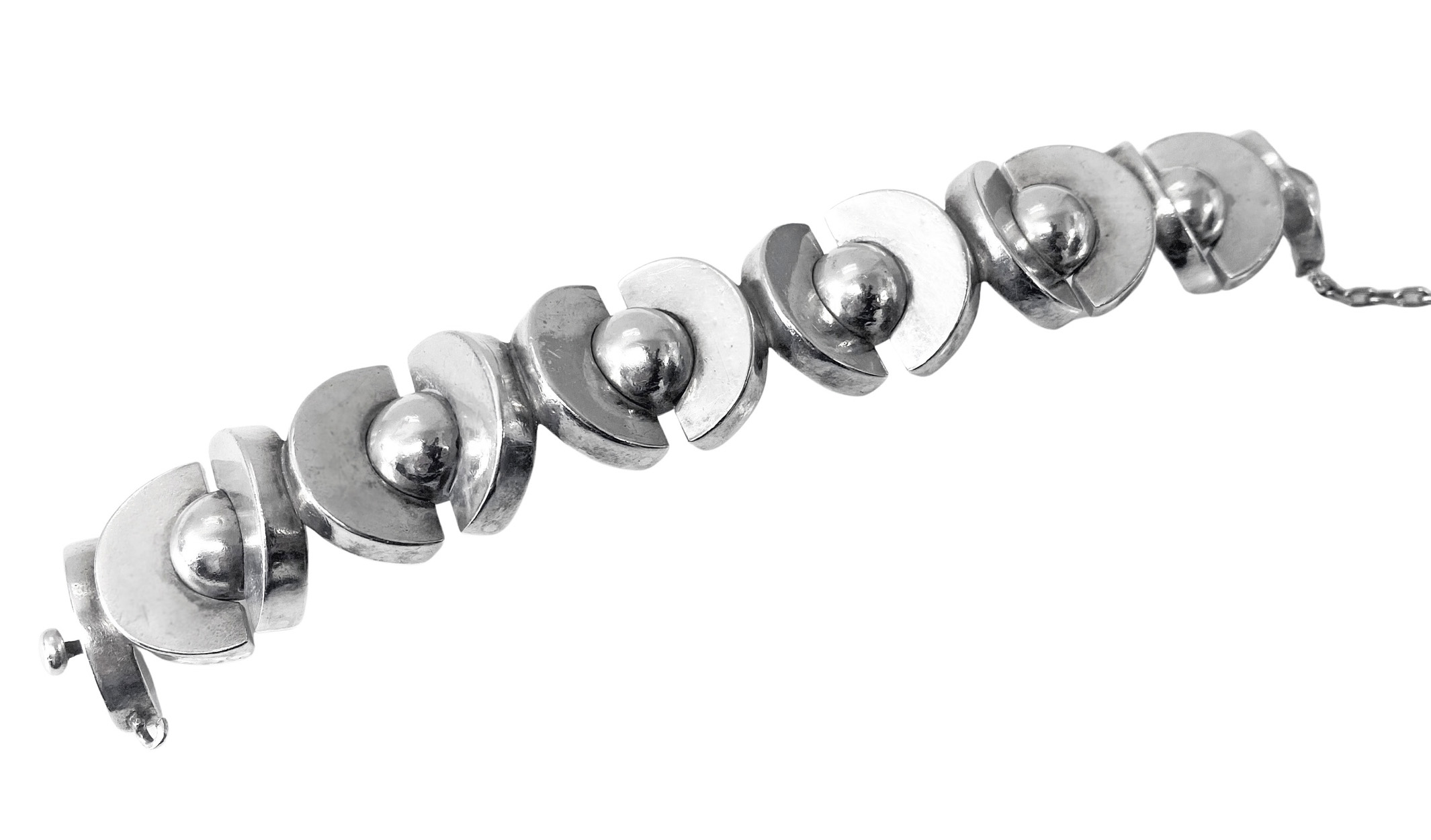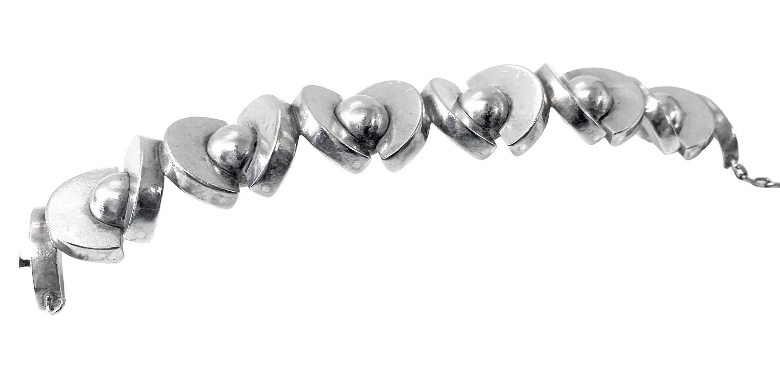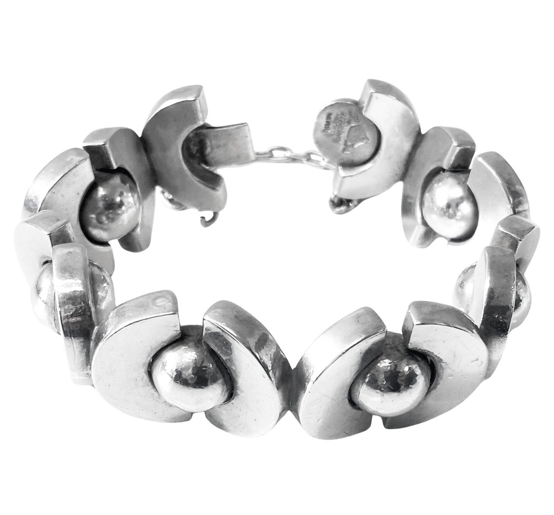 Antoñio Pineda 970 std Silver Mid Century Modernist Bracelet. Pineda’s most sought after spheres designs. The 970 std (higher than sterling), bracelet comprising 14 links each individually attached by hinges. Tongue and groove closure and safety chain, original to the piece. Length: 8″. Weight: 109.5 grams. Marked with Antonio Taxco crown. Condition good. Original patina, has not been overly polished. Reflections from photography only. Antoñio Pineda (1919-2009), was an internationally renowned Mexican Modernist silversmith praised for his bold, striking designs. He studied painting and sculpture as a child, and apprenticed at William Spratling’s Taller de Las Delicias before founding his own workshop in 1941.