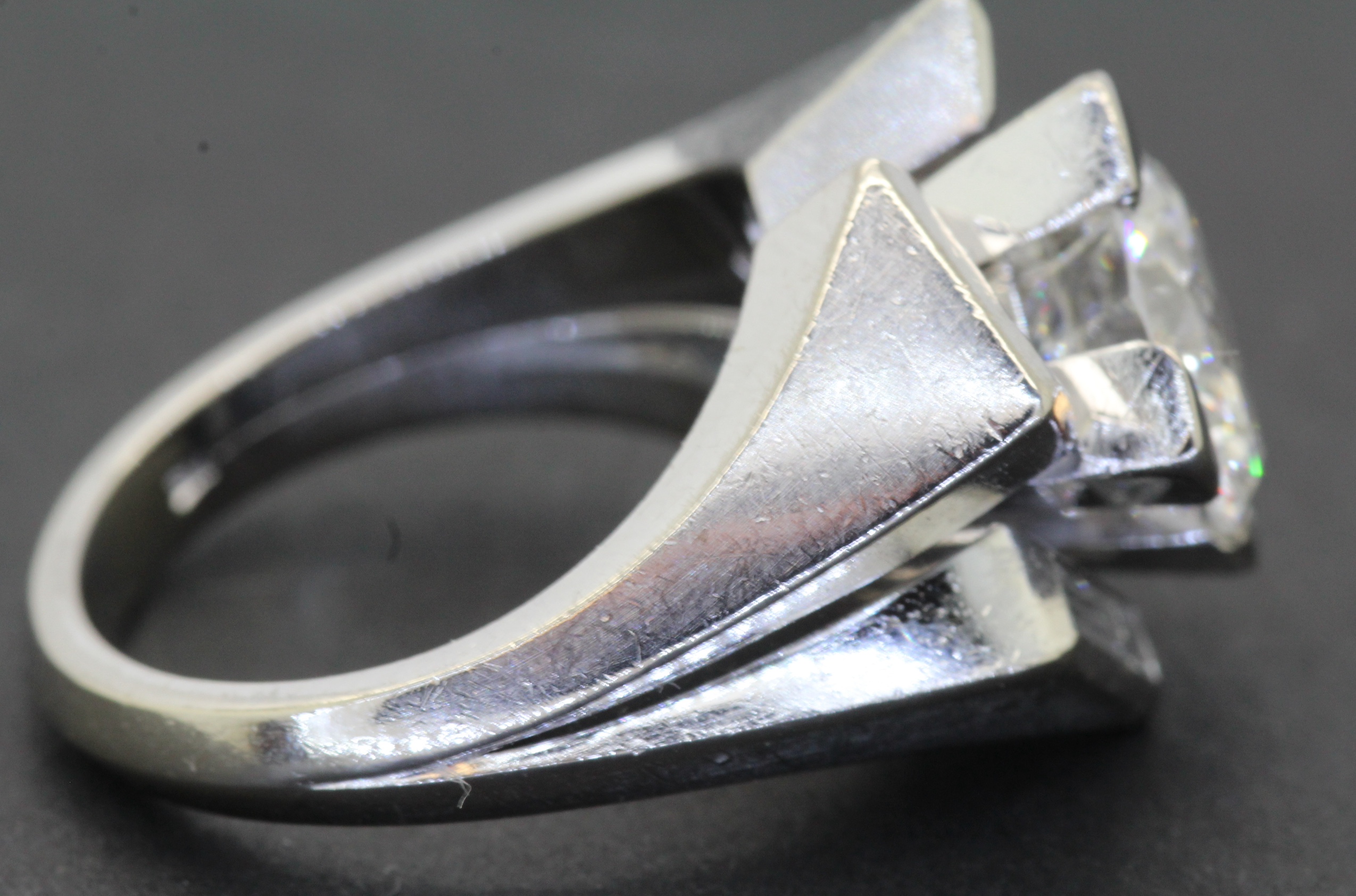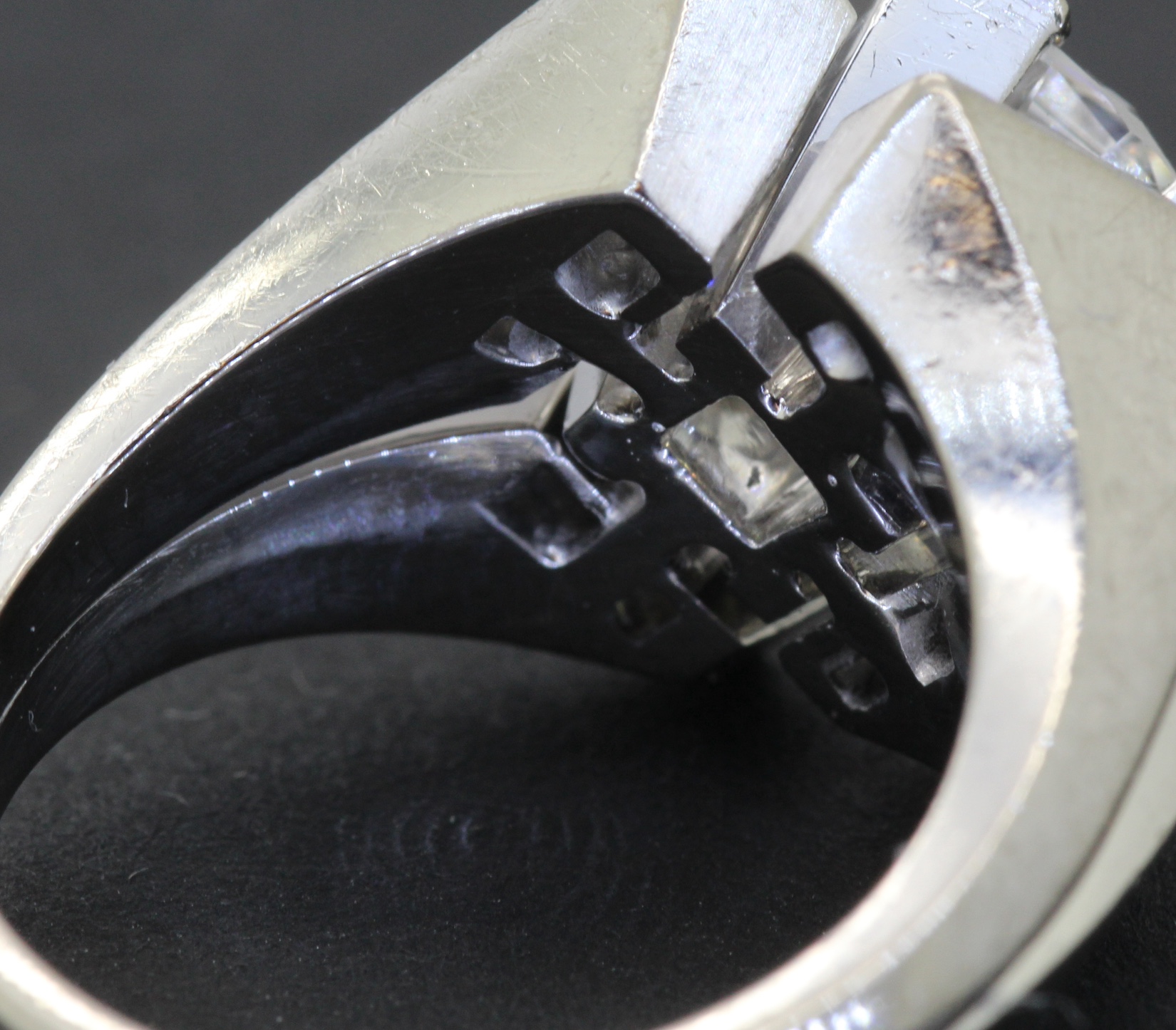 by JW WeldonAmazing Architectural Art Deco diamond ring, set with a 2.4 carat G colour centre stone, in a baguette set diamond swirl, circa 1935. Finger size K. One of the most amazing rings we have ever seen, a stunning design.