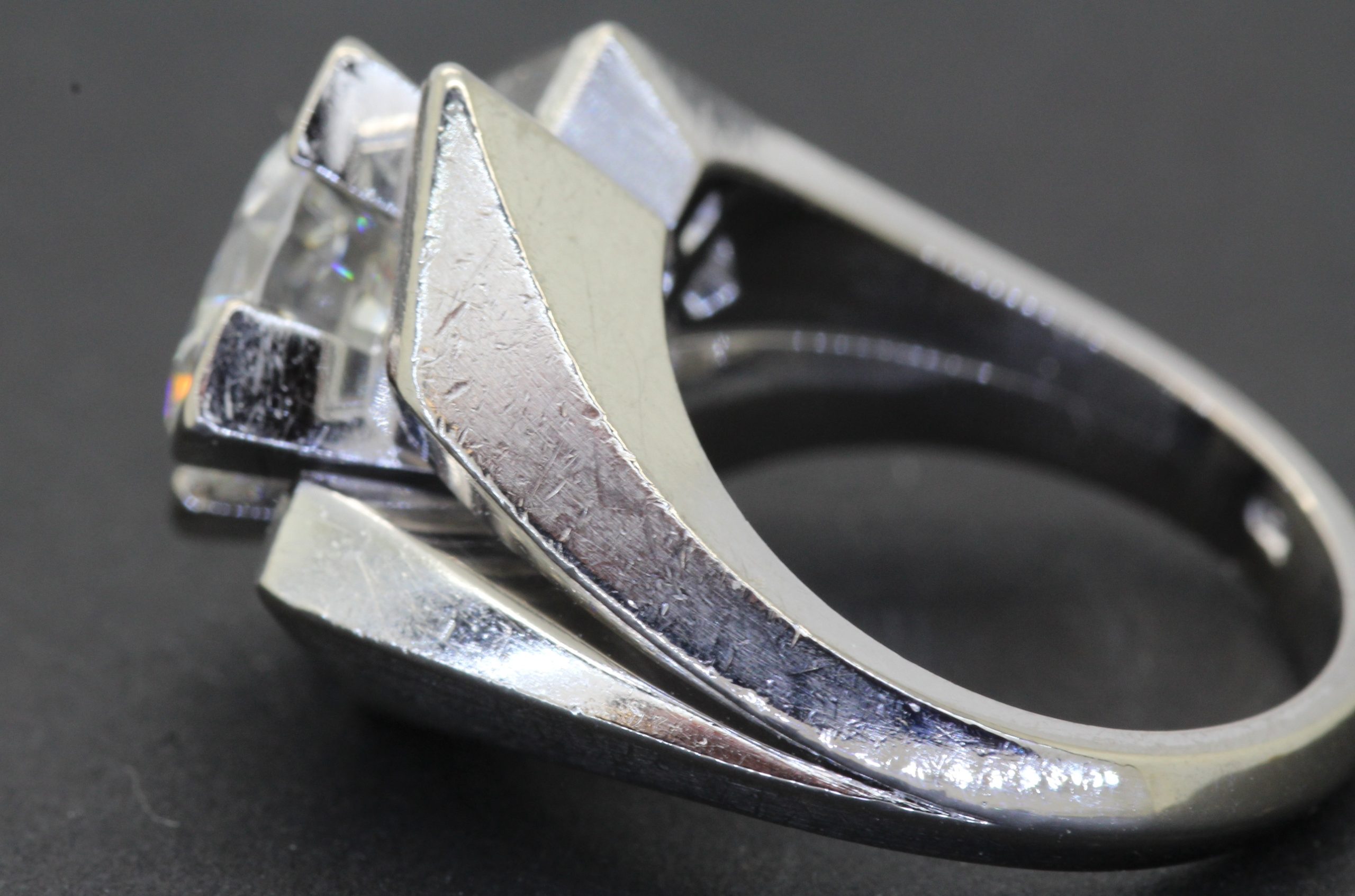 Amazing Architectural Art Deco diamond ring, set with a 2.4 carat G colour centre stone, in a baguette set diamond swirl, circa 1935. Finger size K. One of the most amazing rings we have ever seen, a stunning design.