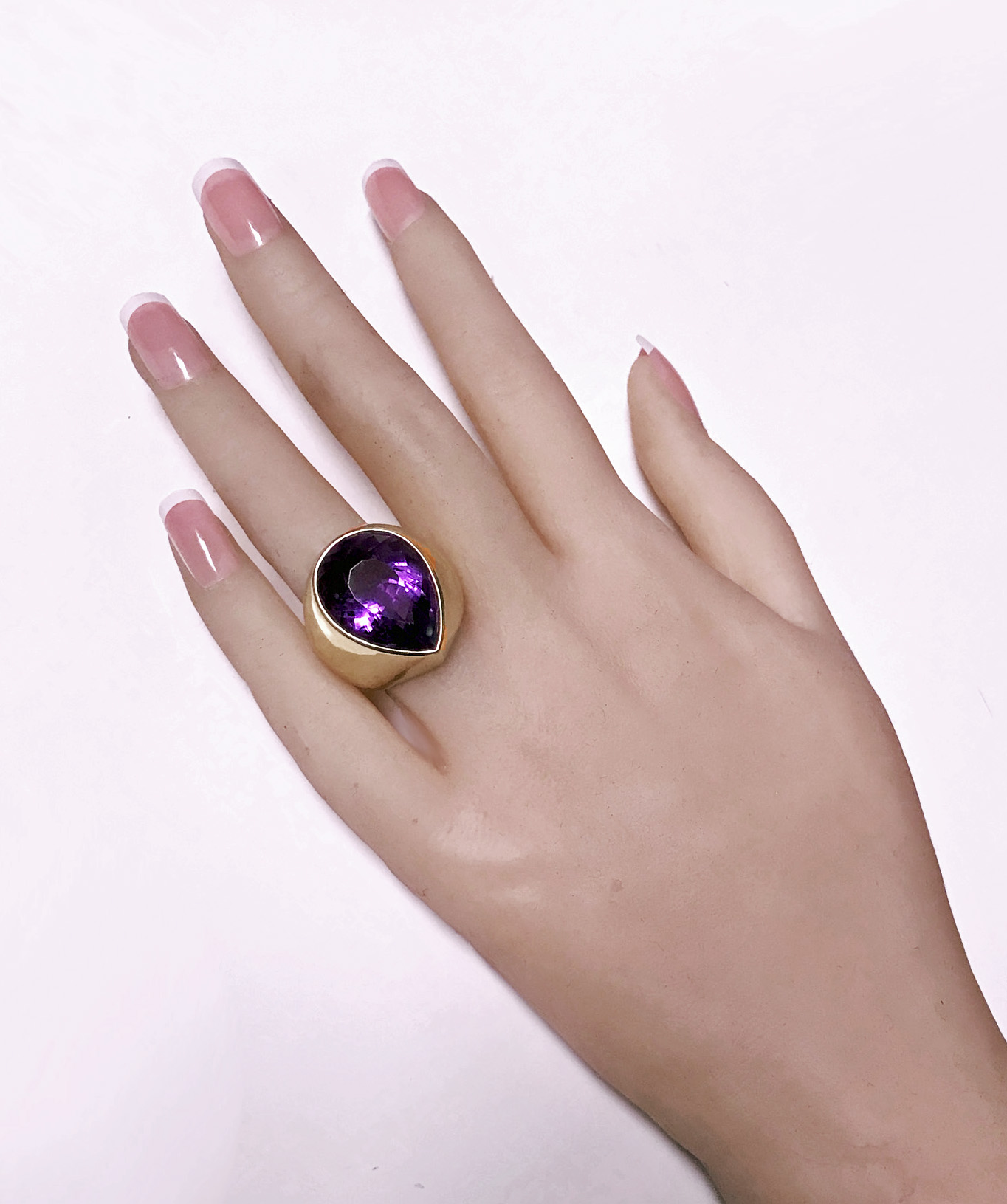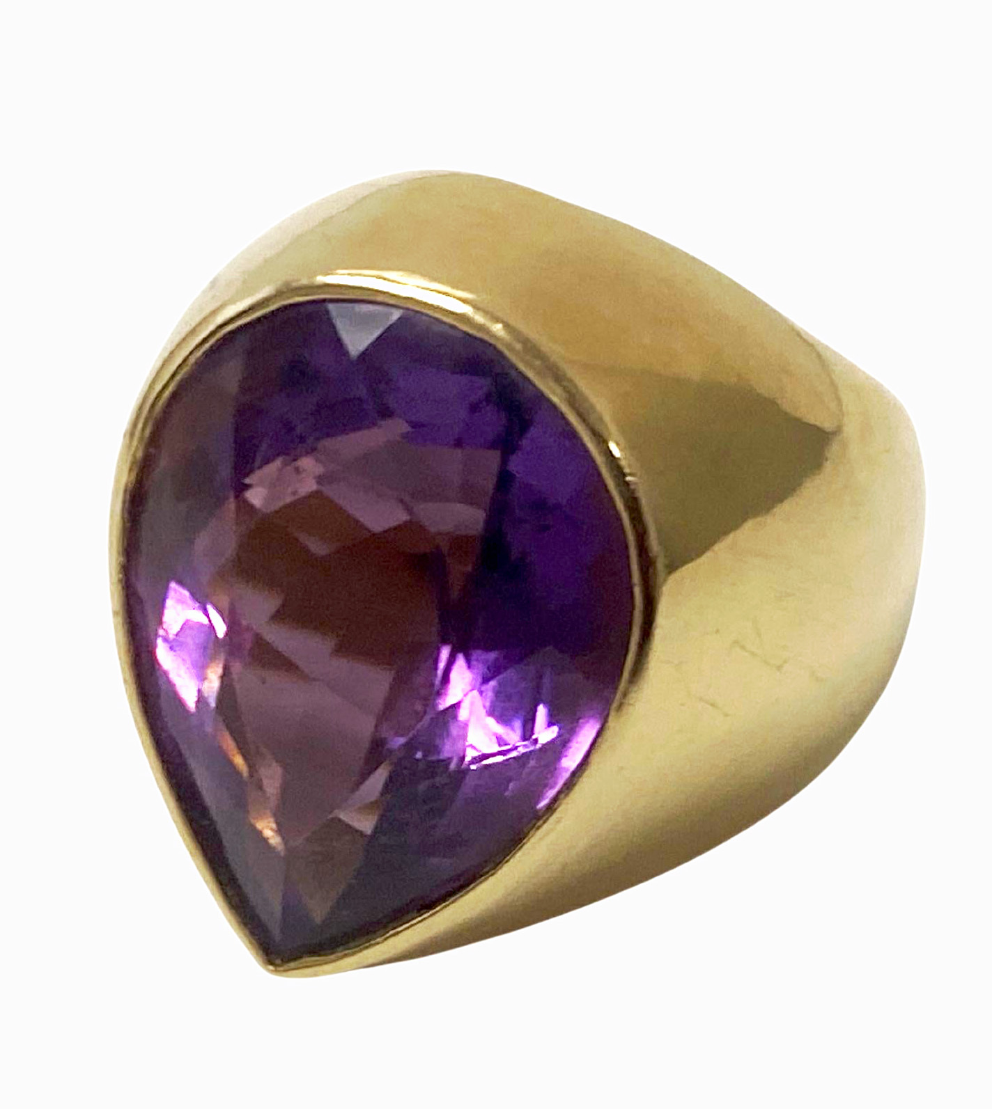 Handmade C.1970 French 18K large Amethyst Ring. The Ring bezel set with a fine purple pear shaped amethyst gauging approximately 21.00 x 16.00 x 10.04 mm, approximately 17 cts, plain wide tapered custom mount and shank. Stamped with French eagle (minimum 18K standard) and maker’s mark on exterior of shank A S symbol between within lozenge. Also stamped Aarhus on interior of shank Ring Size: 7. Total Item Weight: 23.92 grams. Condition: Very good. Lovely colour to amethyst. Reflections purely from photography only.