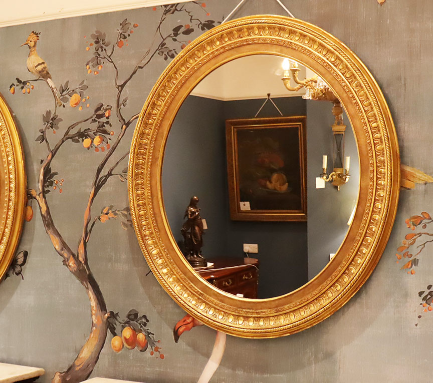 A pair of late 19th century French gilt oval mirrors, with rope, egg and dart, and sand gilt surround.